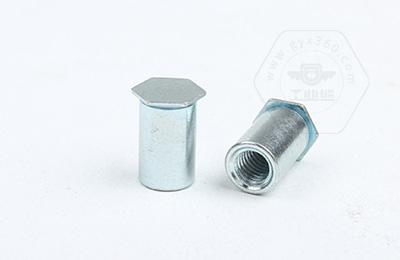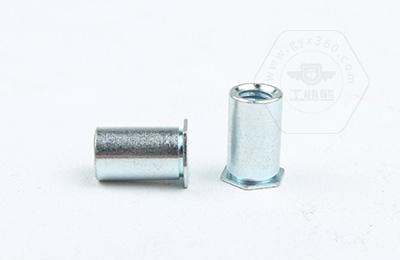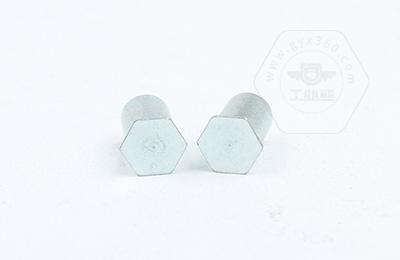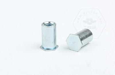 通過壓力機(jī)將六角頭壓入薄板的預(yù)置孔內(nèi)(預(yù)置孔的孔徑一般略大于壓鉚螺柱的圓柱外徑)使孔的周邊產(chǎn)生塑性變形,變形部分被擠入壓鉚螺母柱的退刀槽內(nèi),使壓鉚螺母柱鉚緊于薄板上,從而在薄板上形成一下有效固定的內(nèi)螺紋。